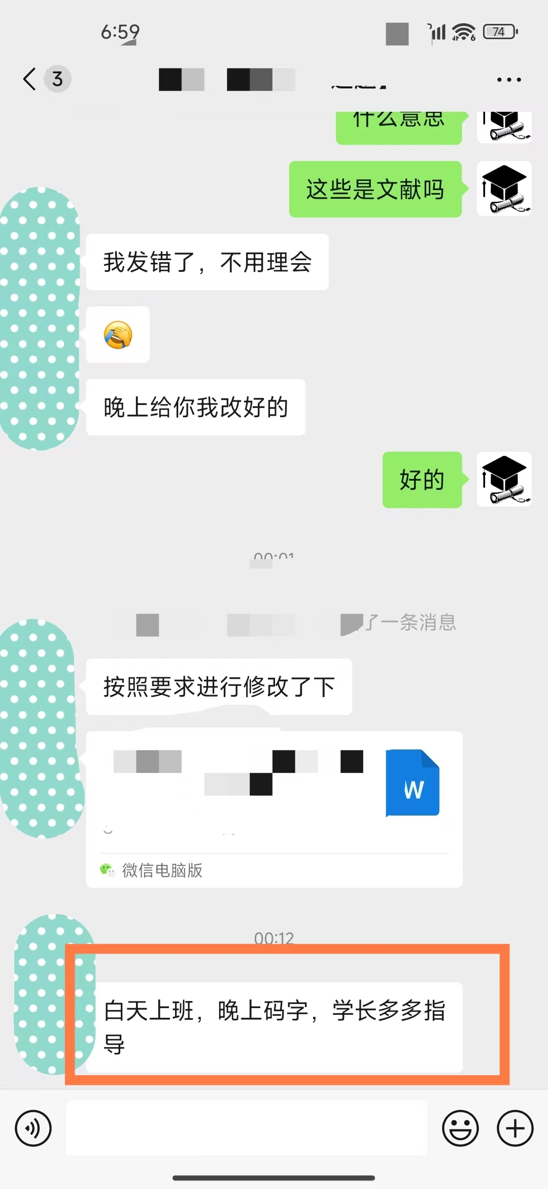 子桐接触很多在职的同学,要么周末,要么晚上处理论文的工作,这也是无奈的选择,既然想进步,想提升,就得克服一些困难,辛苦一点。 最近,有一个在职的硕,工作是律师,非常忙,去年已经被延期,还总被导师PUA,一直让她别写了,放弃吧......对了,还得带娃,写论文真是够艰难的。 困难谁都会面对,更好的策略是化解困难,而不是硬顶,每天一两个小时的投入,一年的功夫也磨出来了,做的还得有心人,大家共勉。
