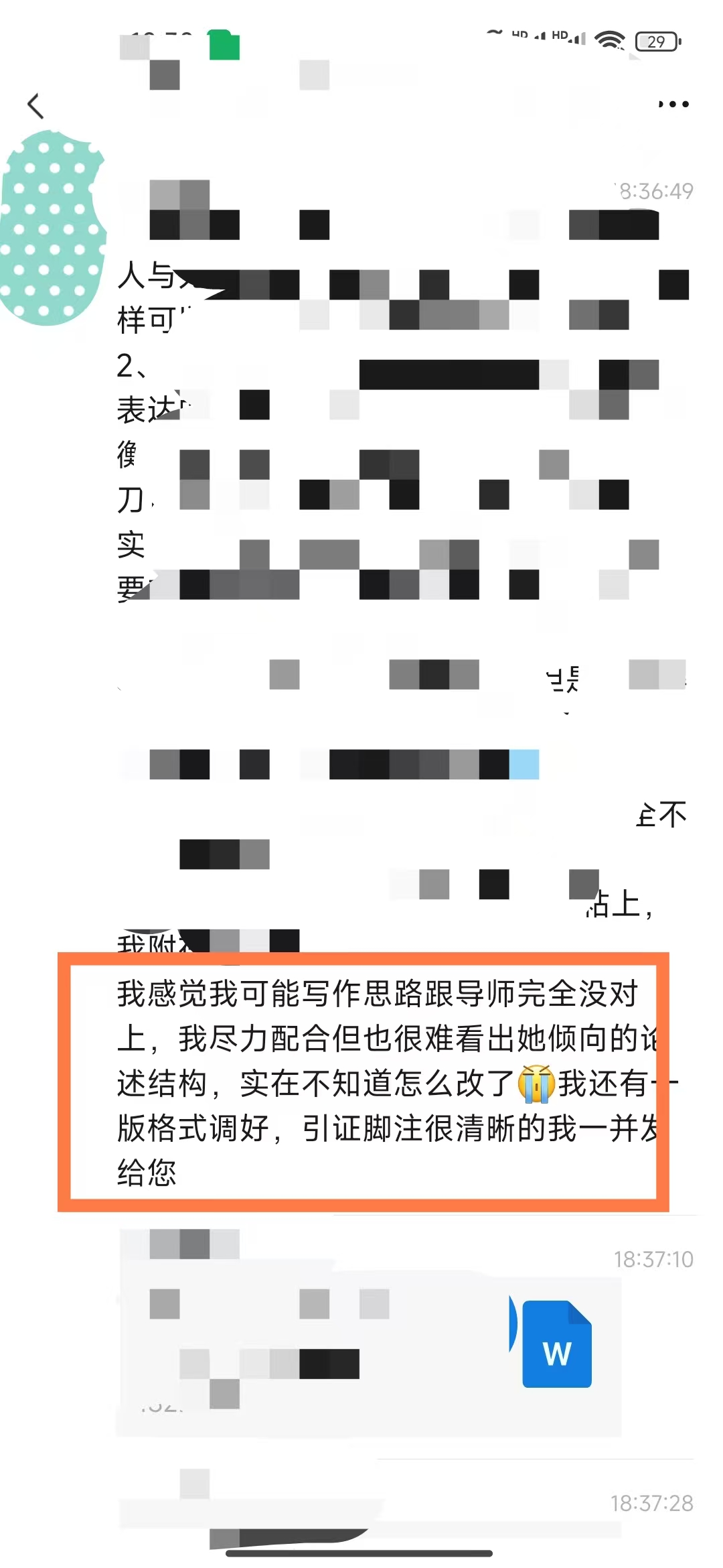 4、两天后就要给学校交,然后寻求指导,我实在是没那本事,指导你把一篇乱七八糟的论文转变为合格的.....所以大家在写作中一定合理的安排好时间,给每一个参与者和自己留出时间,否则,像这名同学的情况,木已成舟,时间又这么短,不好调整。
